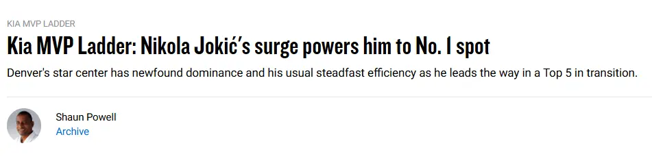 北京技艺11月14日体育录像/图片,NBA官网更新了MVP名次榜,约基奇升至首位。和上周相似,前五位依然齐是海外球员。以下是具体排名妥协析——